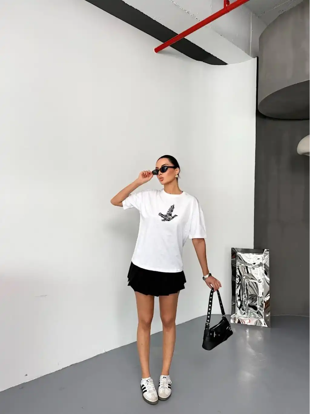 Ördek Baskılı ve Yuvarlak Yakalı Kadın Günlük Büyük Boy Siyah Tişört. - Beyaz