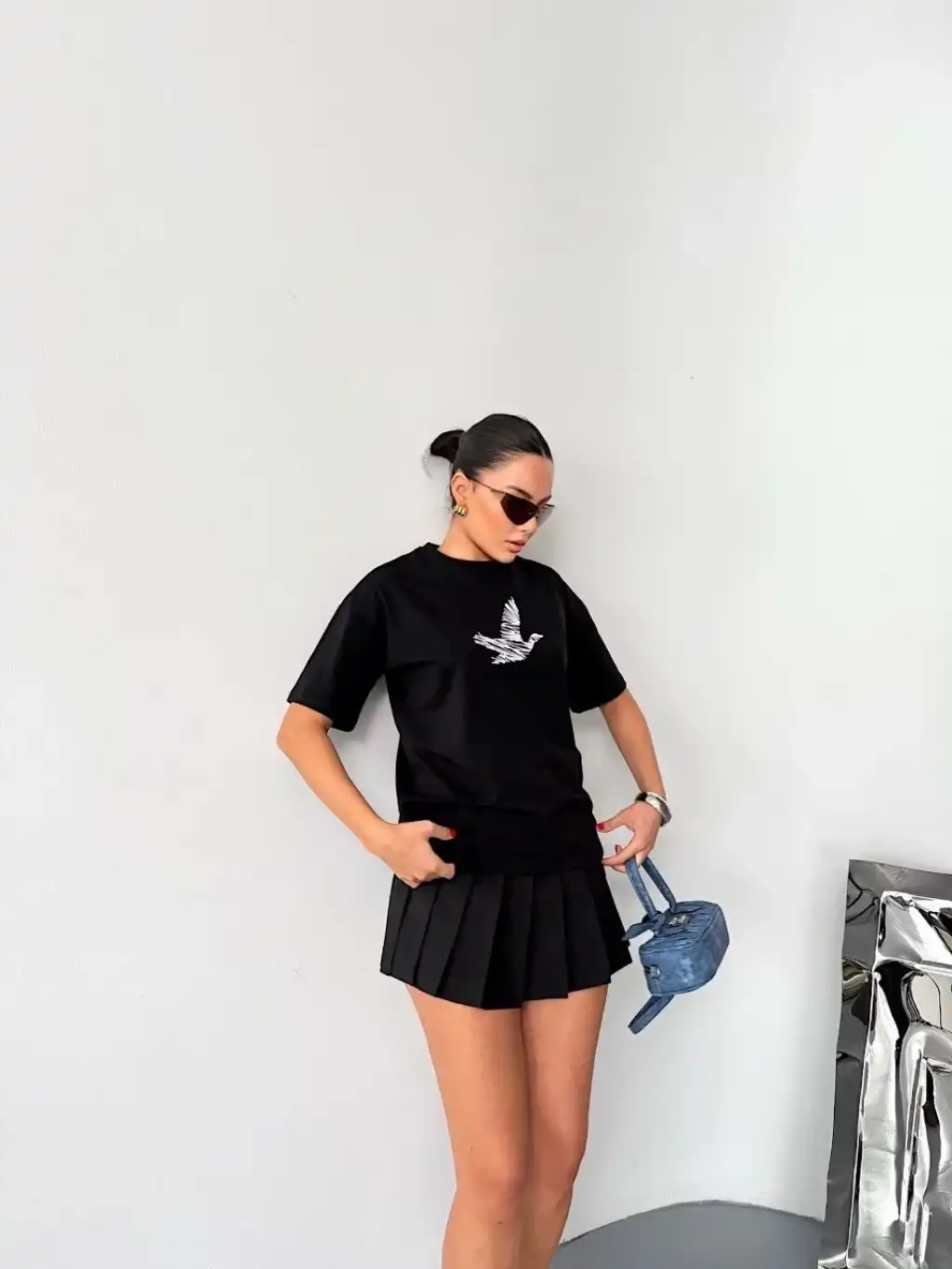 Ördek Baskılı ve Yuvarlak Yakalı Kadın Günlük Büyük Boy Siyah Tişört. - Siyah