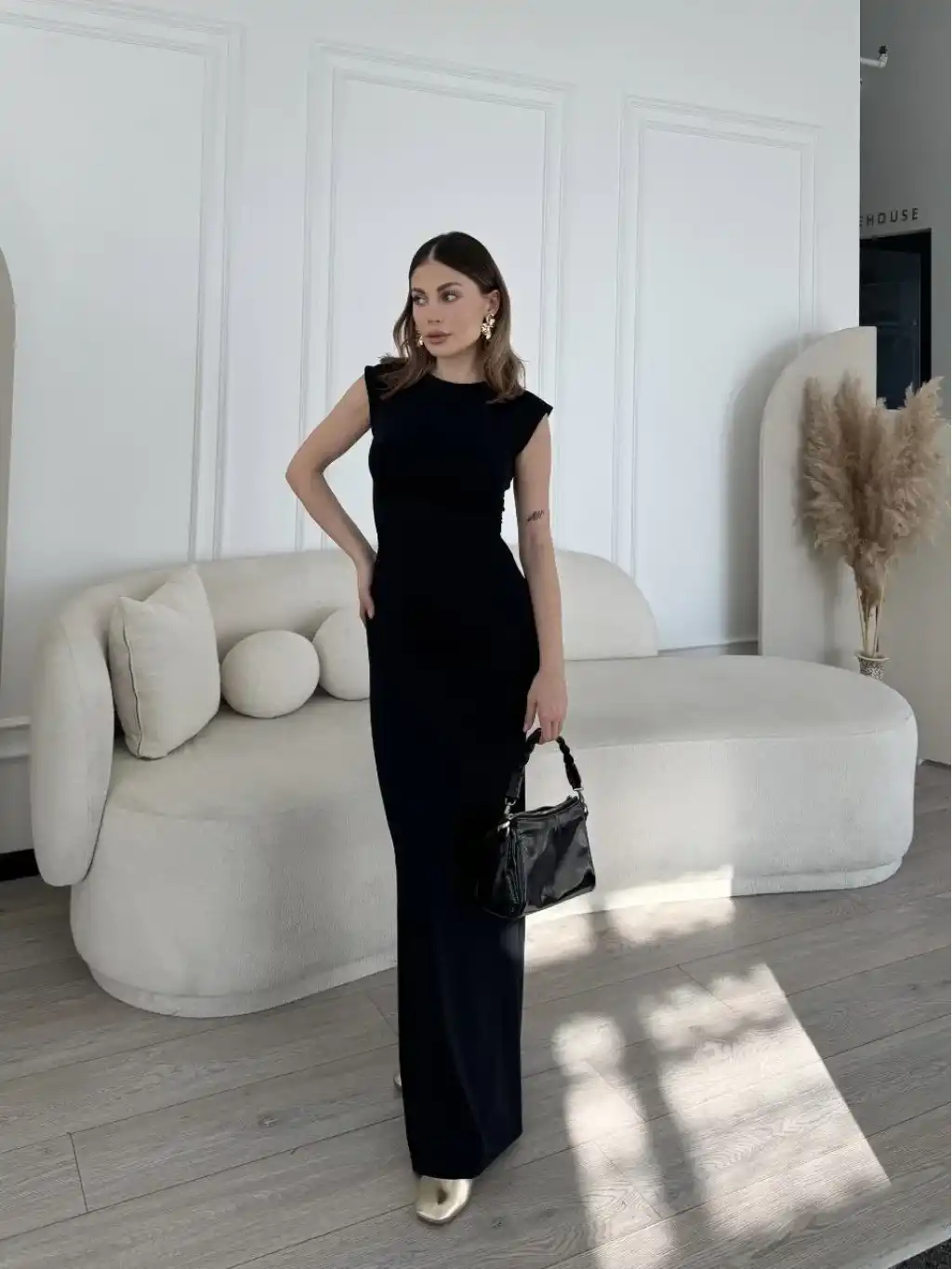 Sırt Dekolteli Kolsuz Uzun Elbise - Siyah