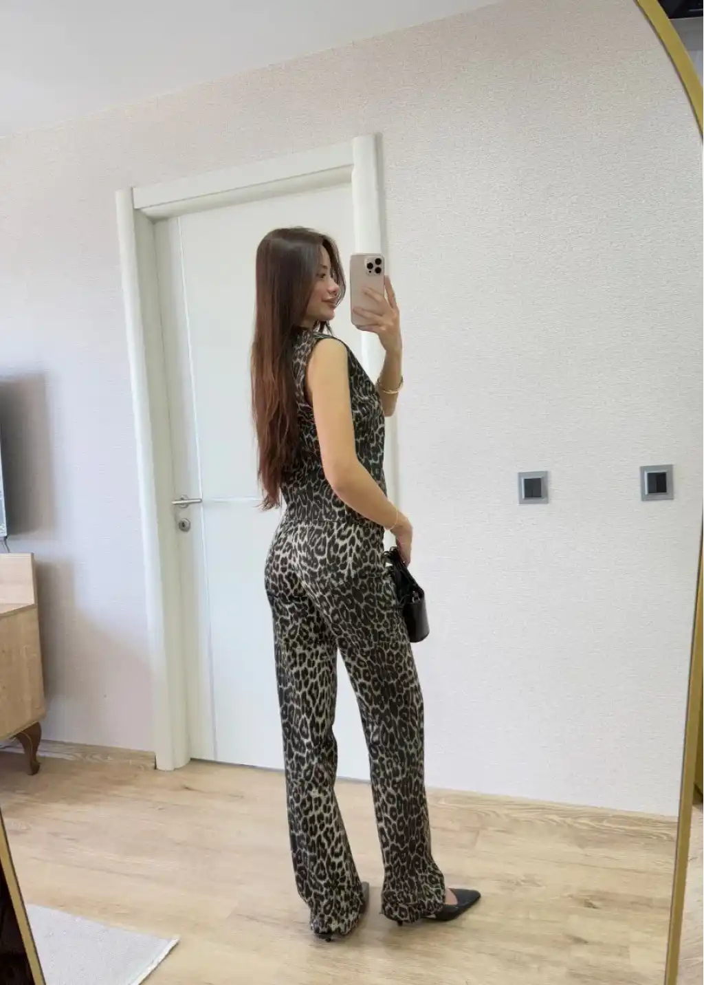 leopar desenli Düğmeli Bluzlu Pantolon İkili Takım -Leopar