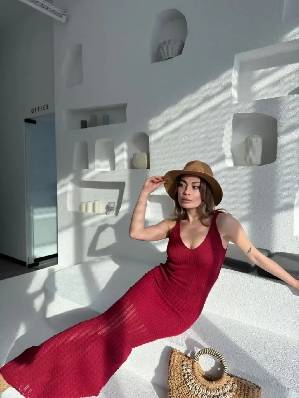 Krep Arkası Kanat Arka Ön Pens Detaylı Uzun Kadın Elbise - Bordo