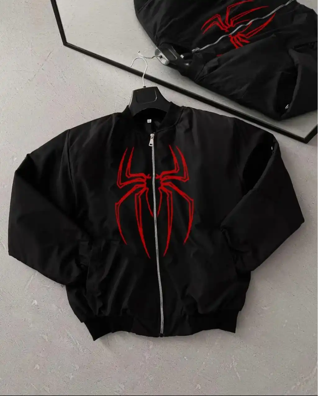 Örümcek Desenli Siyah Bomber Mont – Unisex Kullanıma Uygun, Fermuarlı Cepli, Kapitone Astarlı, Bahar Kış Günlük Giyim İçin Moda Ceket Modeli - Siyah