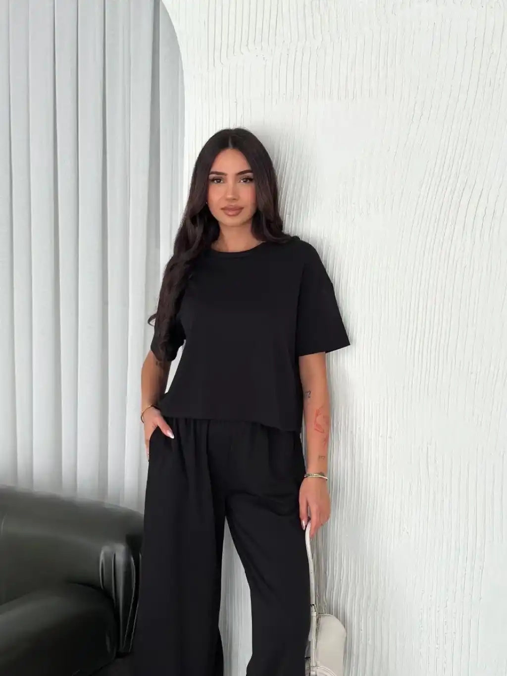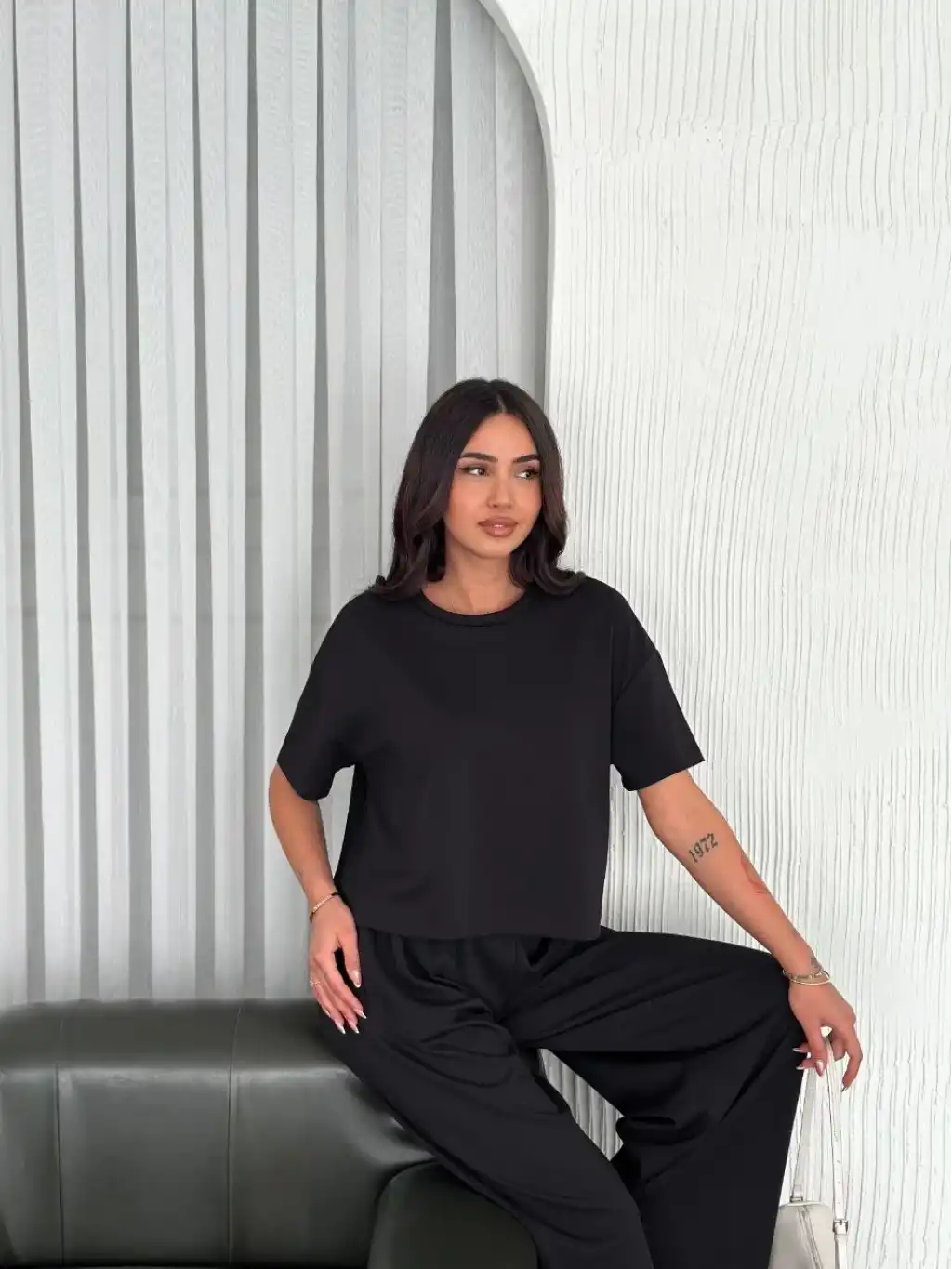 Osy Modal Yumuşak Dokulu Kumaş Bisiklet Yaka T-shirt Bol paça Pantalon ikili Takım -Siyah