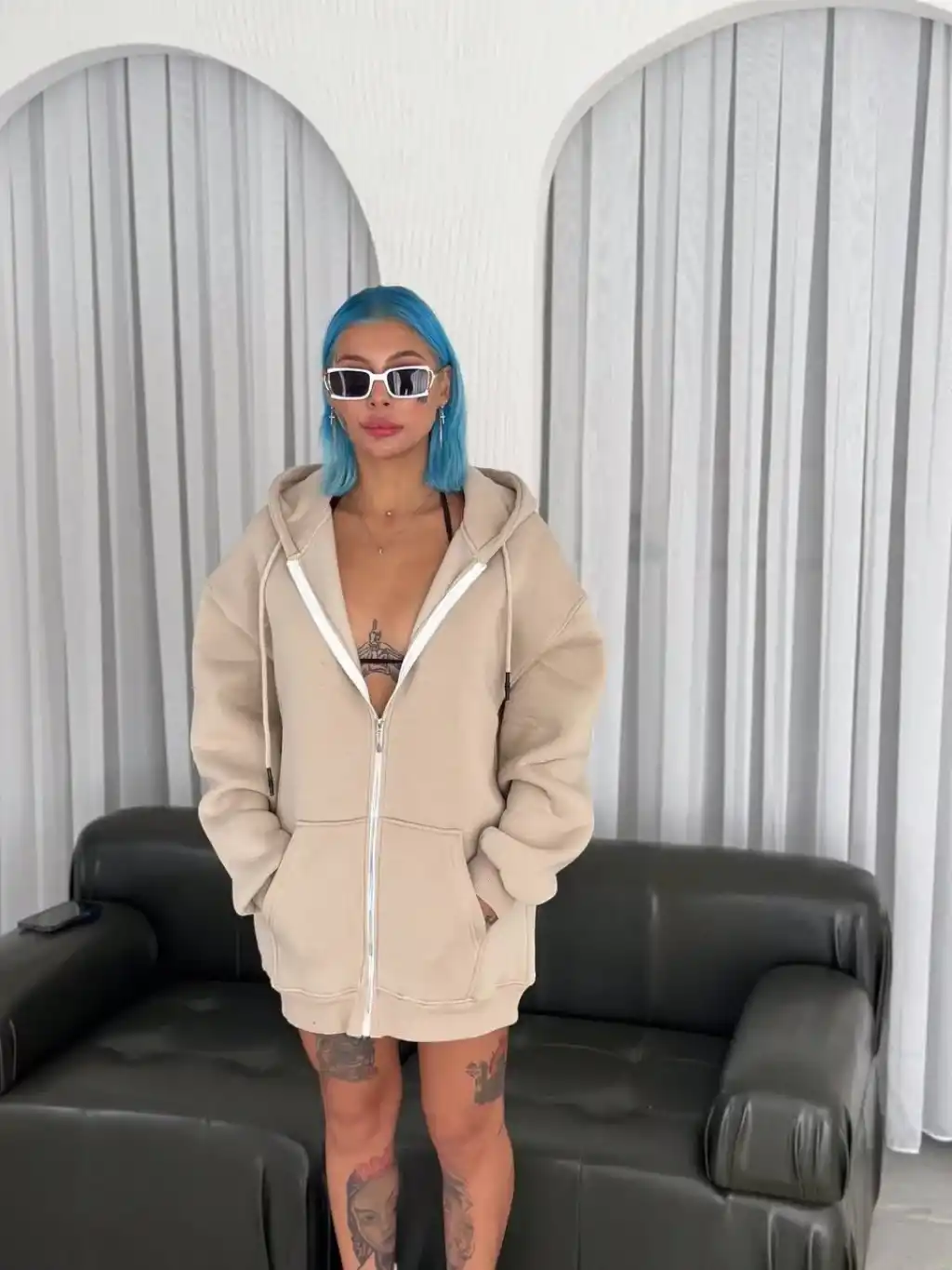 Oversize Tam Fermuarlı Uzun Kol Hırka - Bej