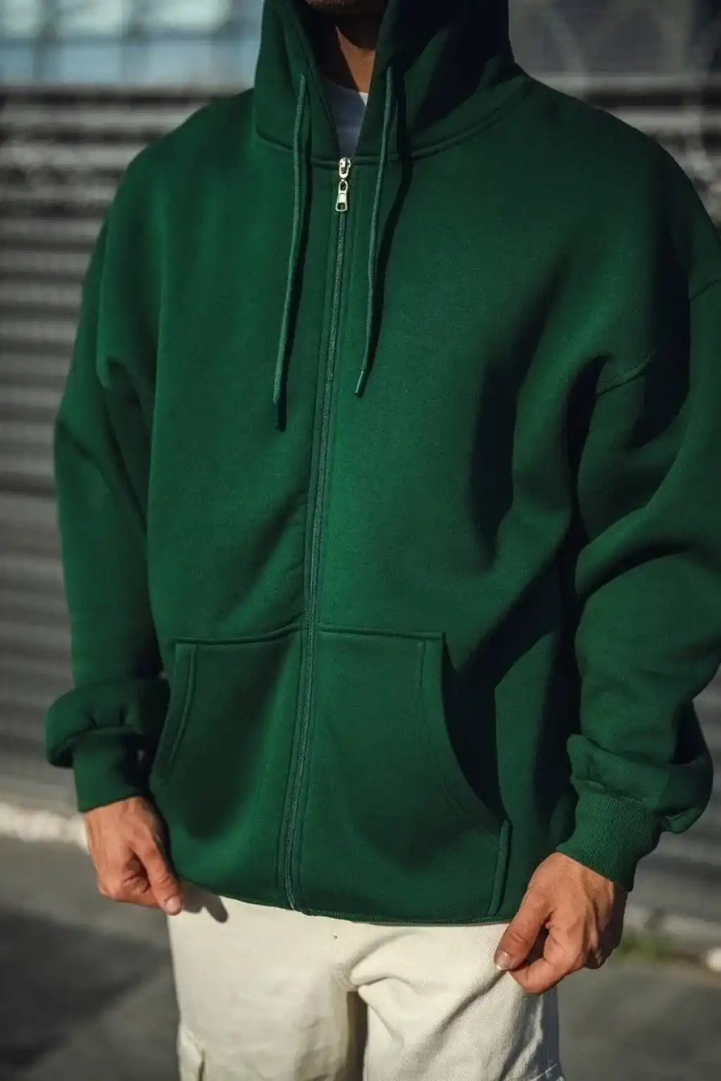 Erkek Kapüşonlu 3 İplik Şardonlu Önü Baskılı Fermuarlı Oversize Sweatshirt - Beyaz