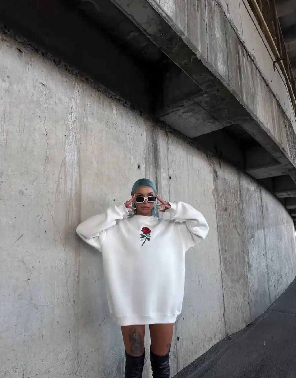 Oversize Üç İplik Bisiklet Yaka Baskılı SweatShirt - Beyaz