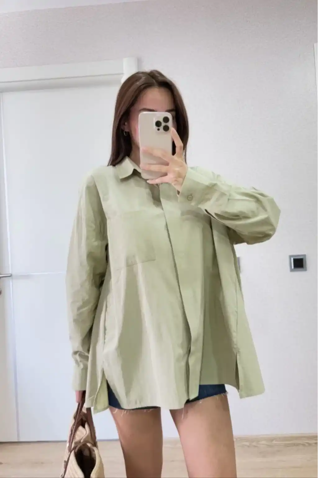 Poplin Kadın Yakalı Yandan Yırtmaçlı Arka Pens Detaylı Gömlek - Yeşil