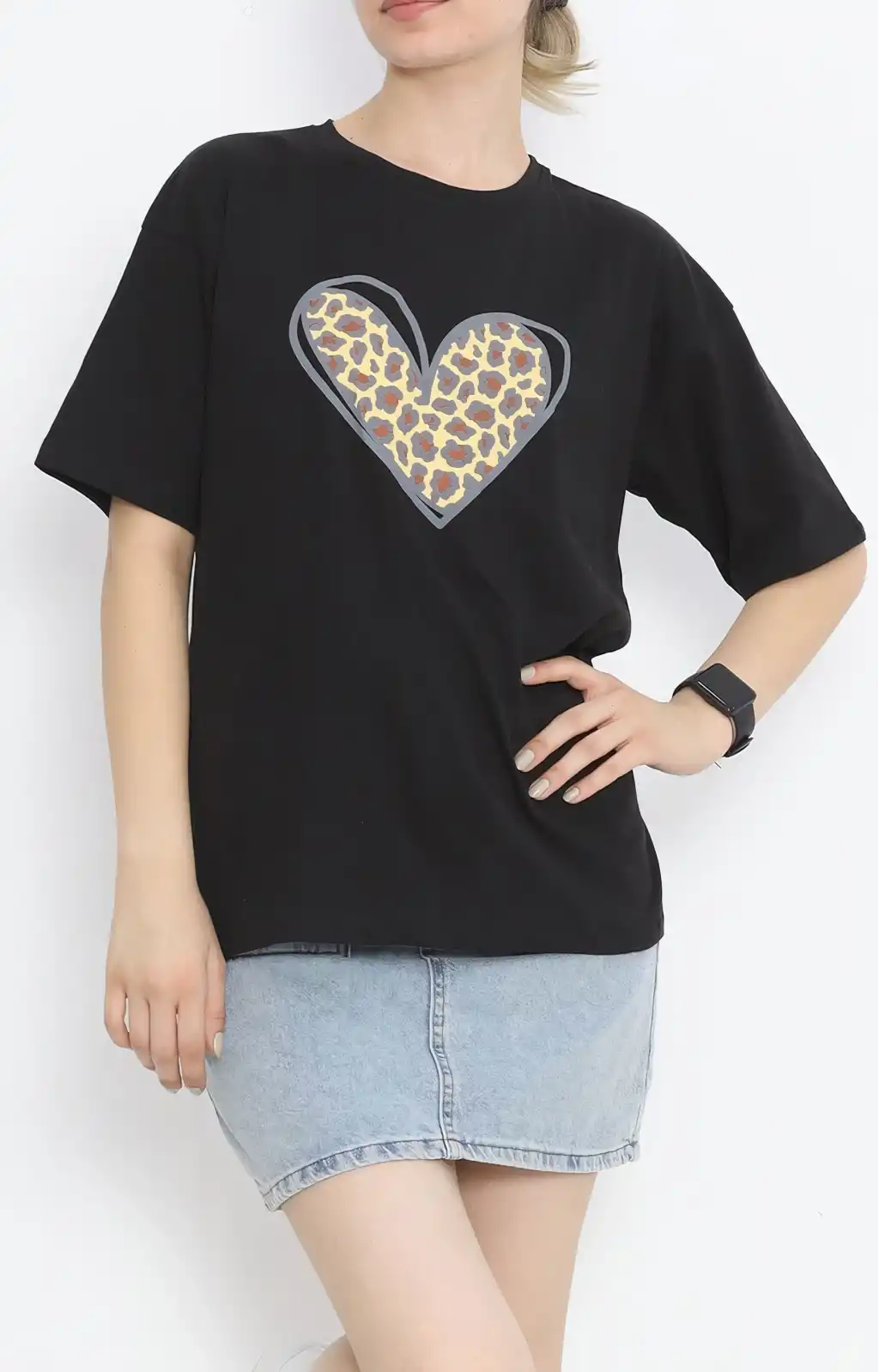 Sevgililer Günü İçin Özel Tasarım Leopar Kalp Baskılı T-shirt - Siyah