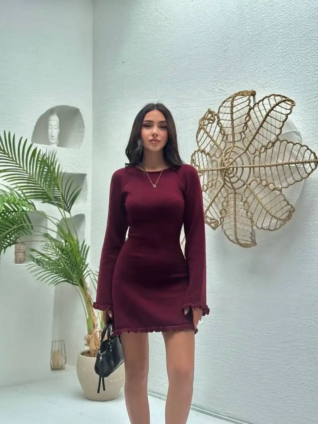 Sırt Pencereli Mini Triko Elbise - Bordo