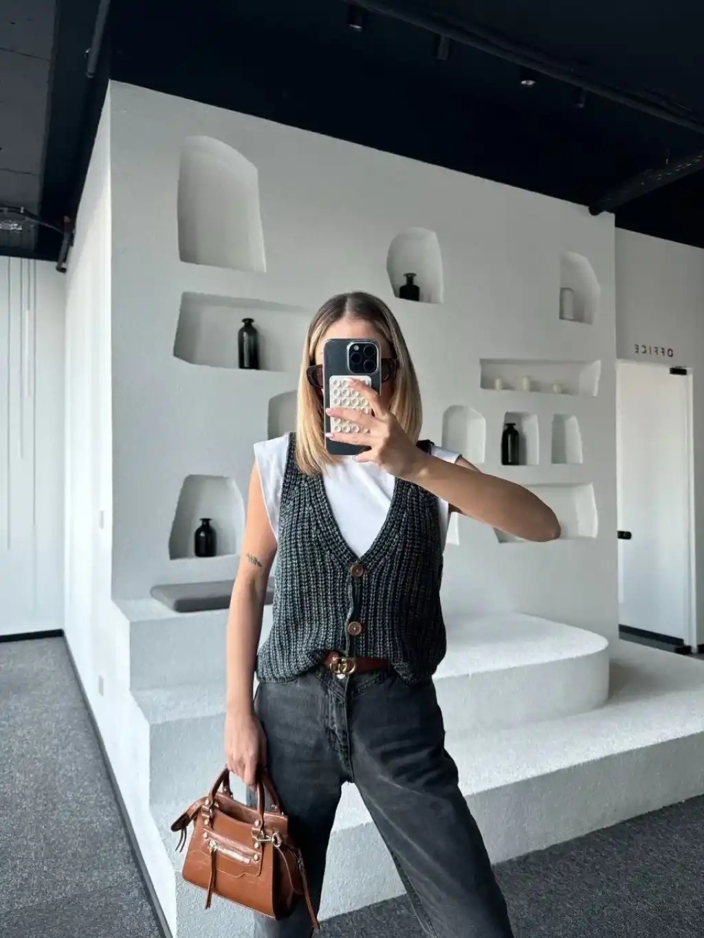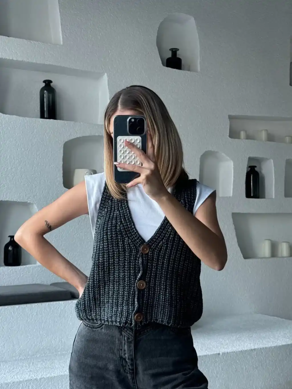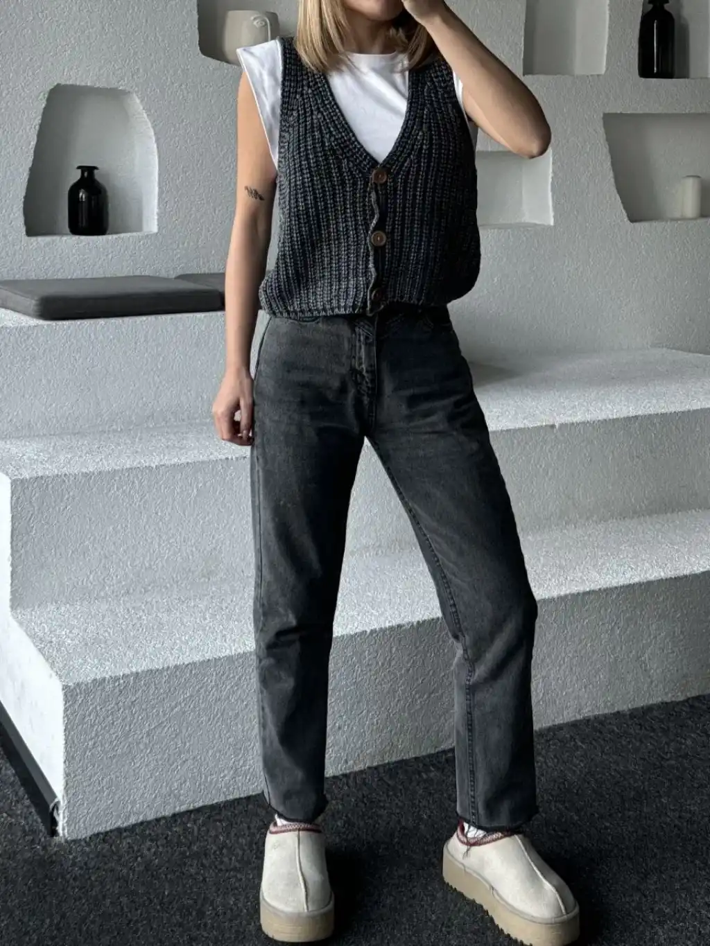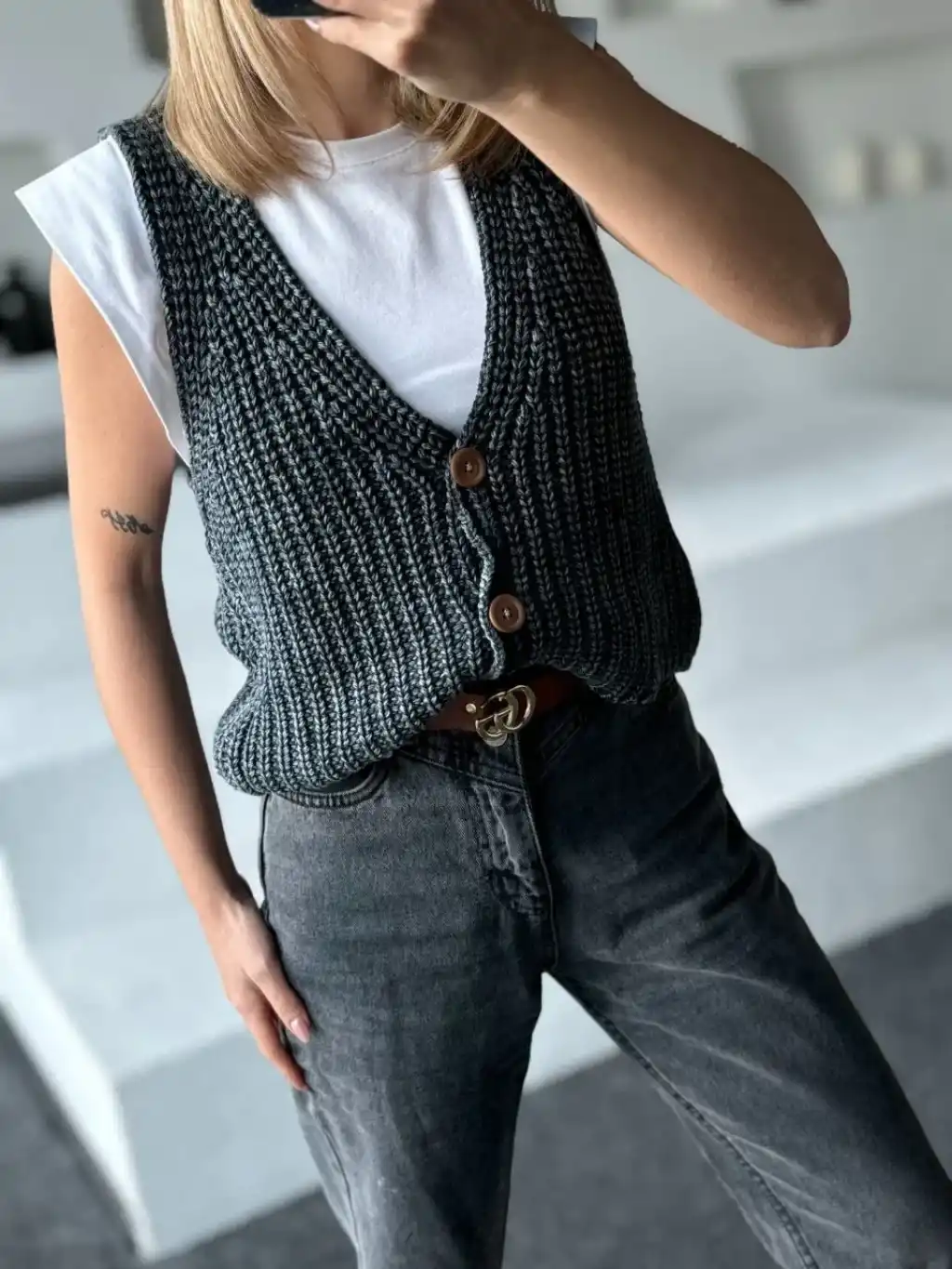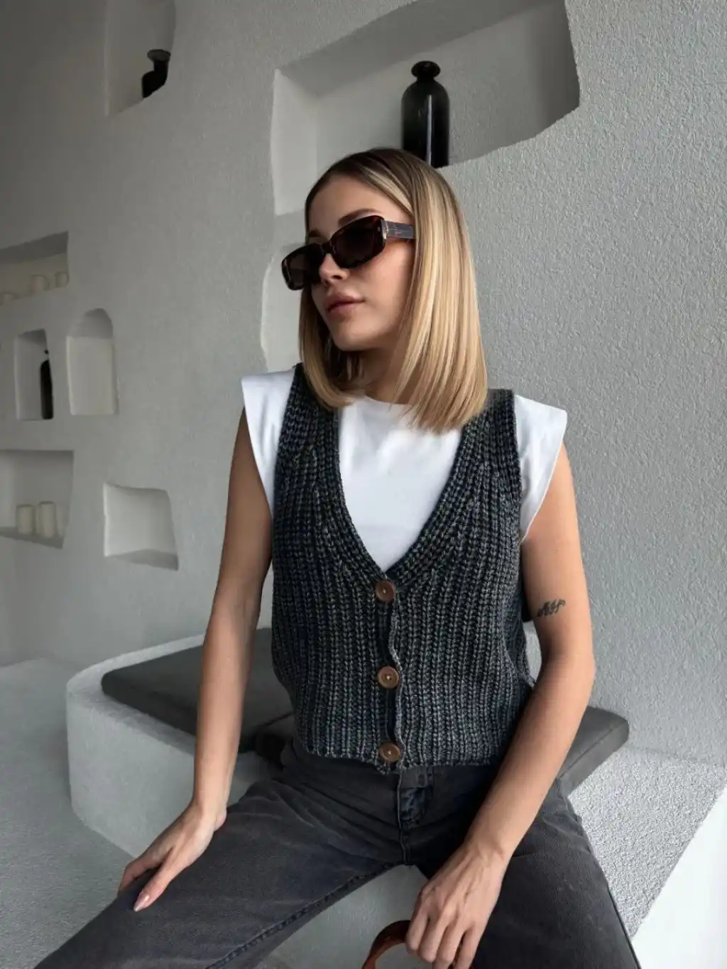 Triko Kolsuz Düğmeli Yelek - Siyah