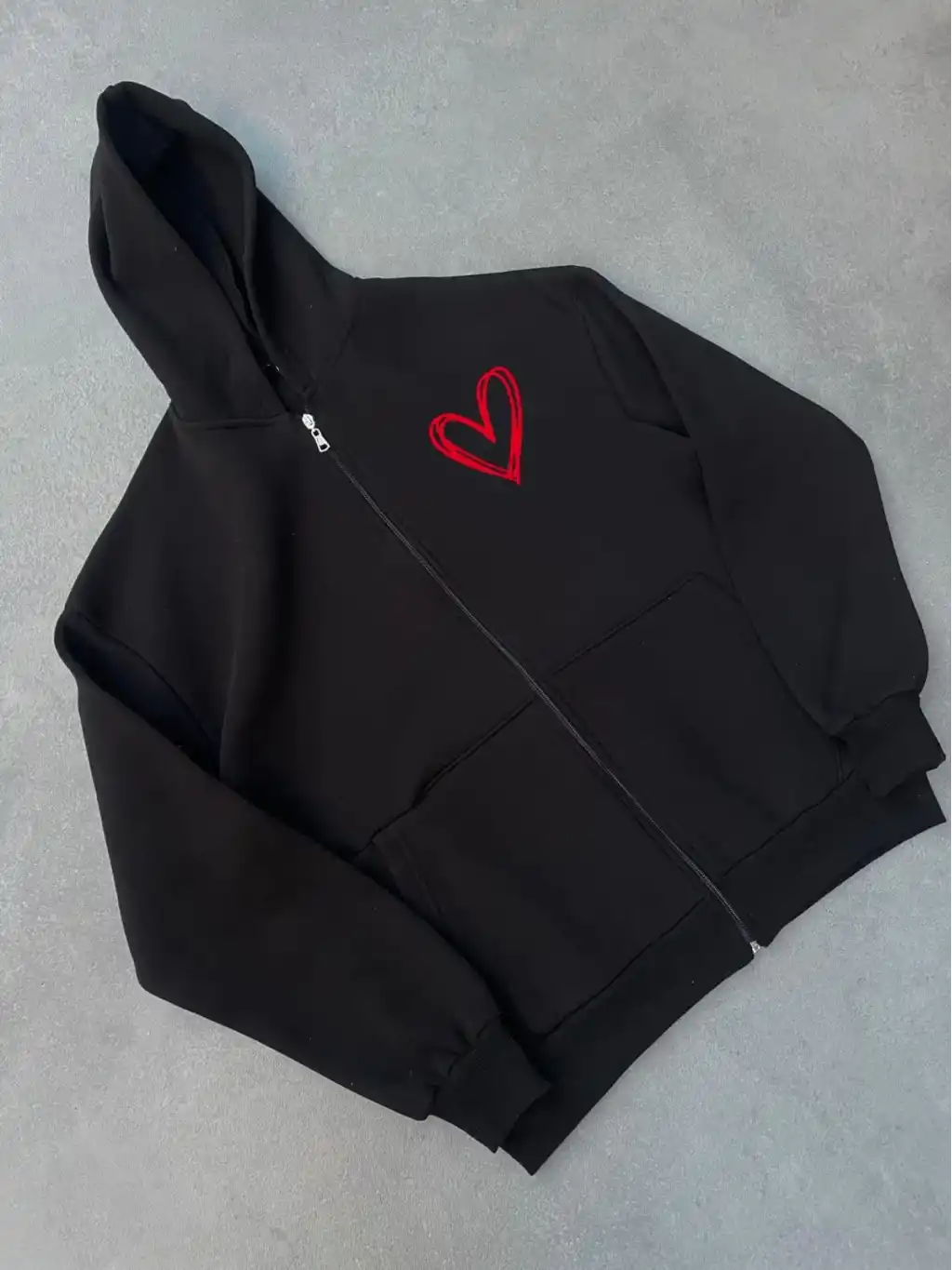 Üç İplik Baskılı Fermuarlı Kapüşonlu Hırka - Siyah