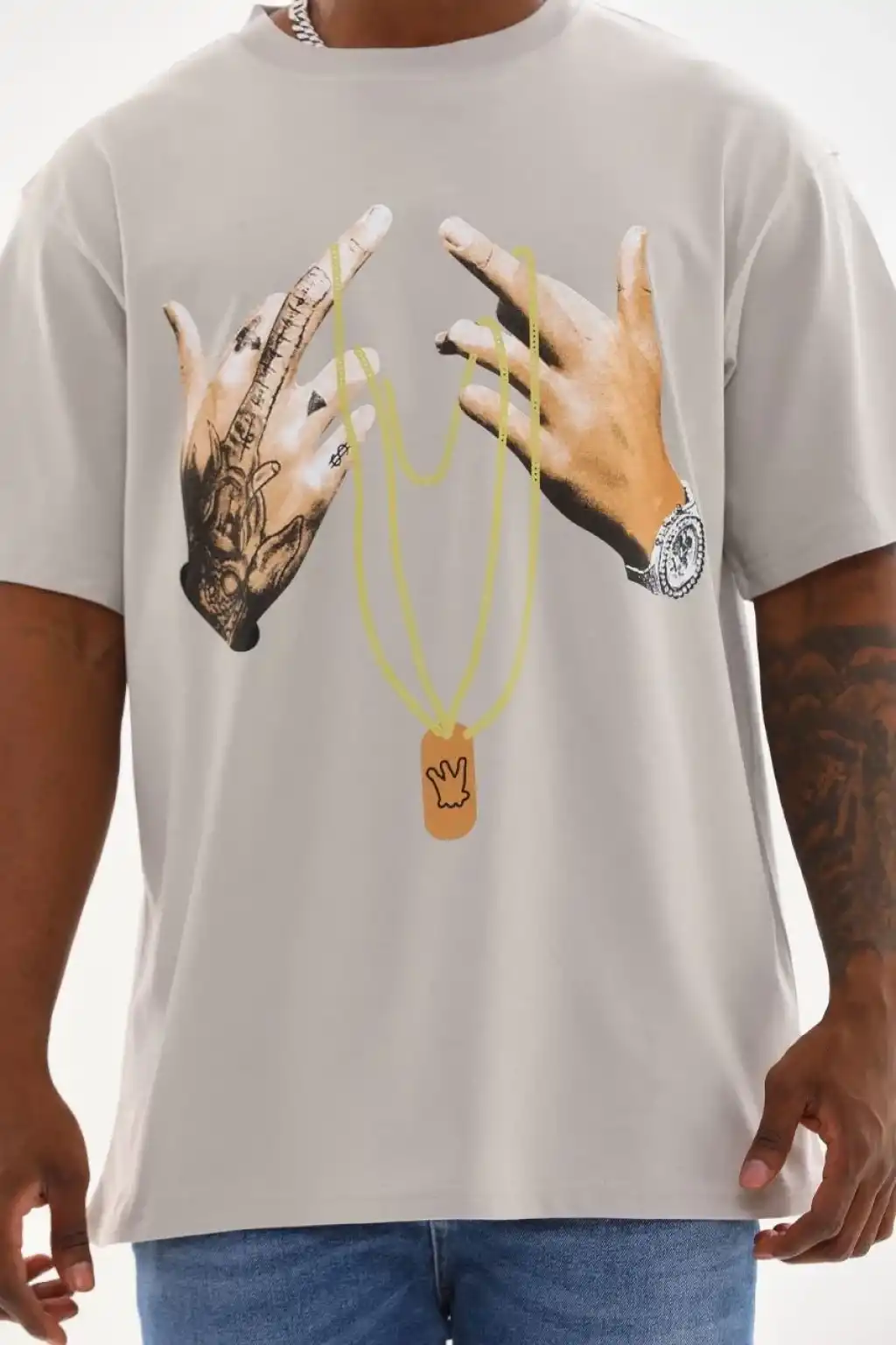 Erkek Sırt Baskılı Oversize T-shirt - Bej