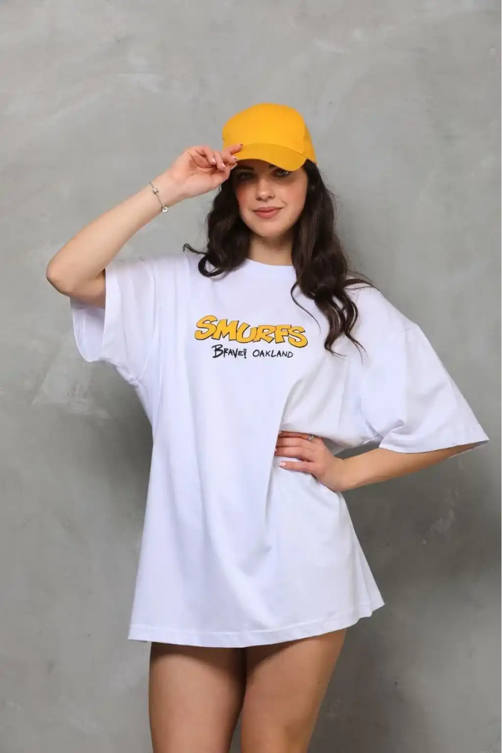 AICG Ön Arka Baskılı Bisiklet Yaka Kadın Oversize Bisiklet Yaka T-shirt - Beyaz