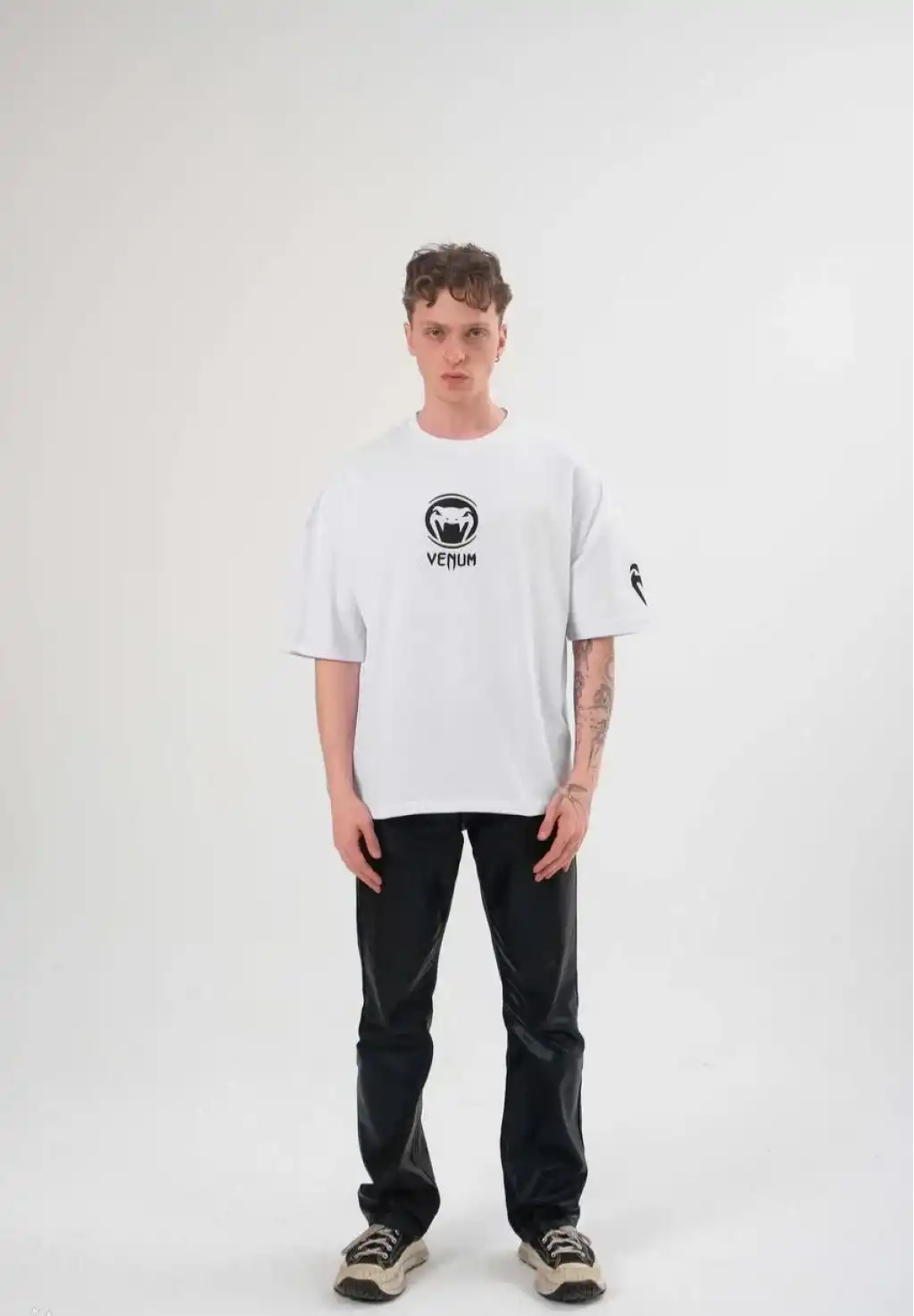 Unisex Bisiklet Yaka Baskılı Oversize T-Shirt - Beyaz