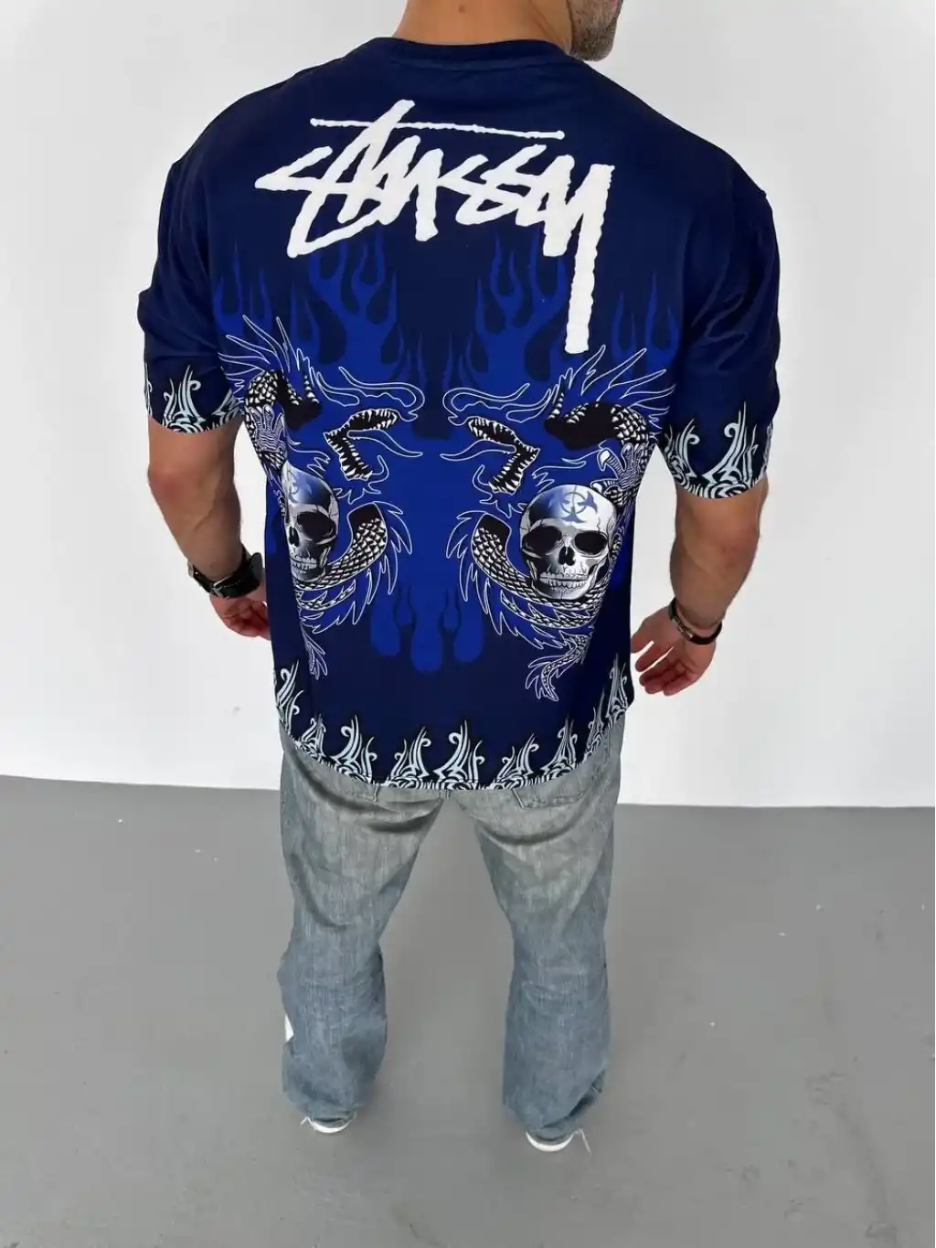 Benzersiz Sırt Baskılı Erkek Sokak Stili Bol Tişört - Nefes Alabilir Polyester, Makinede Yıkanabilir - Siyah