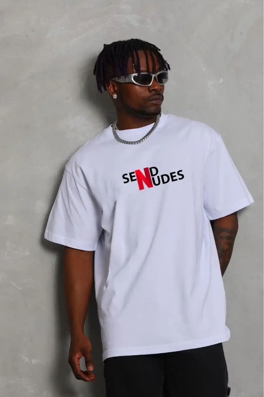 Unisex Bisiklet Yaka Double Oversize Baskılı T-Shirt - Beyaz