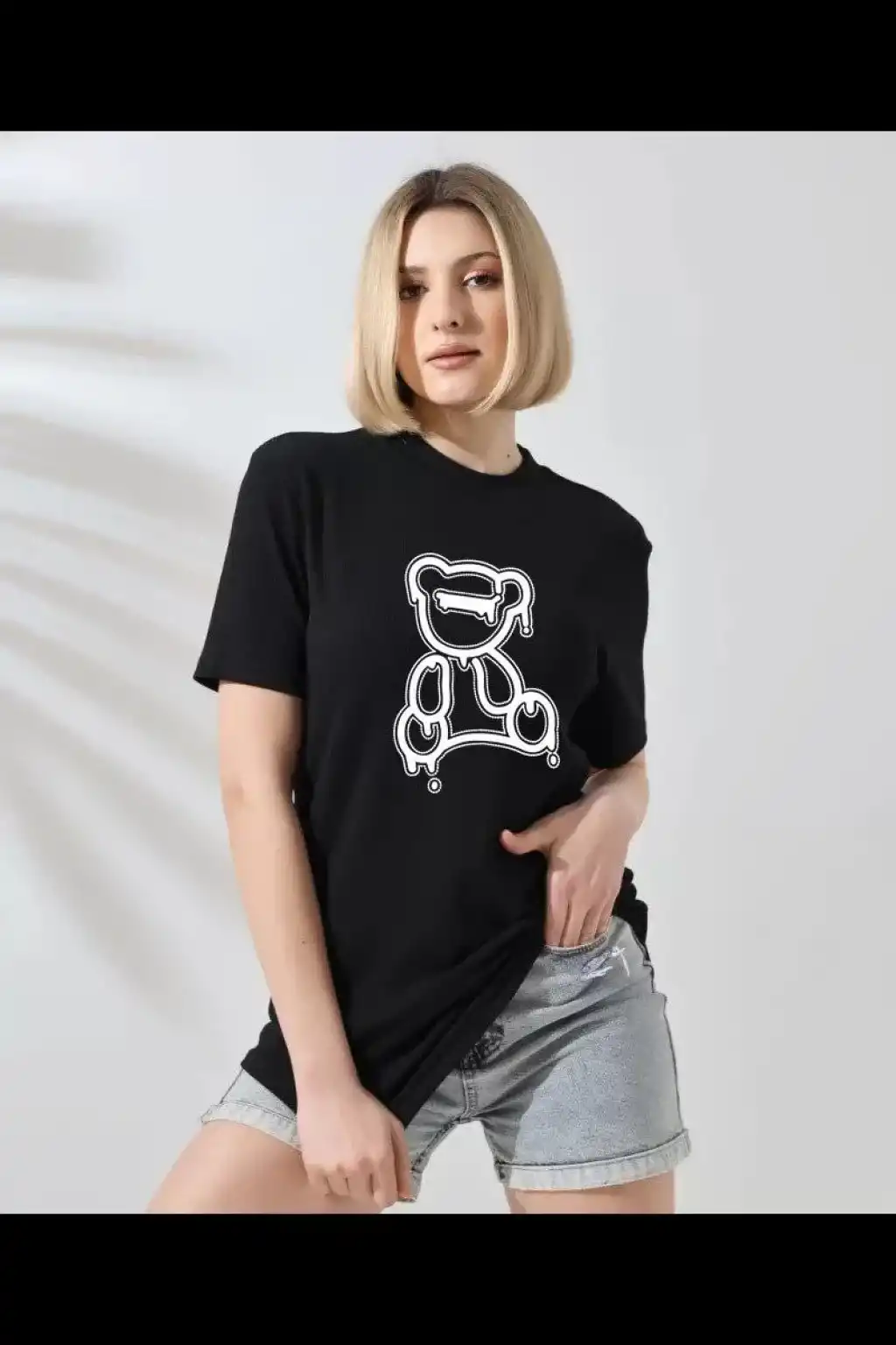 [Günlük T-Shirt] Hafif Kadın Günlük T-Shirt | Bol Kesim, Kısa Kollu, Yuvarlak Yaka, Eğlenceli Karikatür Ayı ve "Umrumda Değil" Baskı - Günlük Stil, İlkbahar/Yaz- Siyah