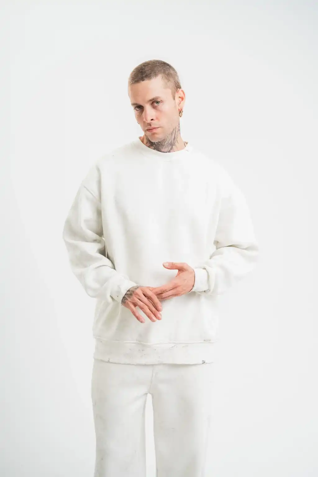 Unisex Uzun Kol Bisiklet Yaka Yıkamalı SweatShirt - Beyaz