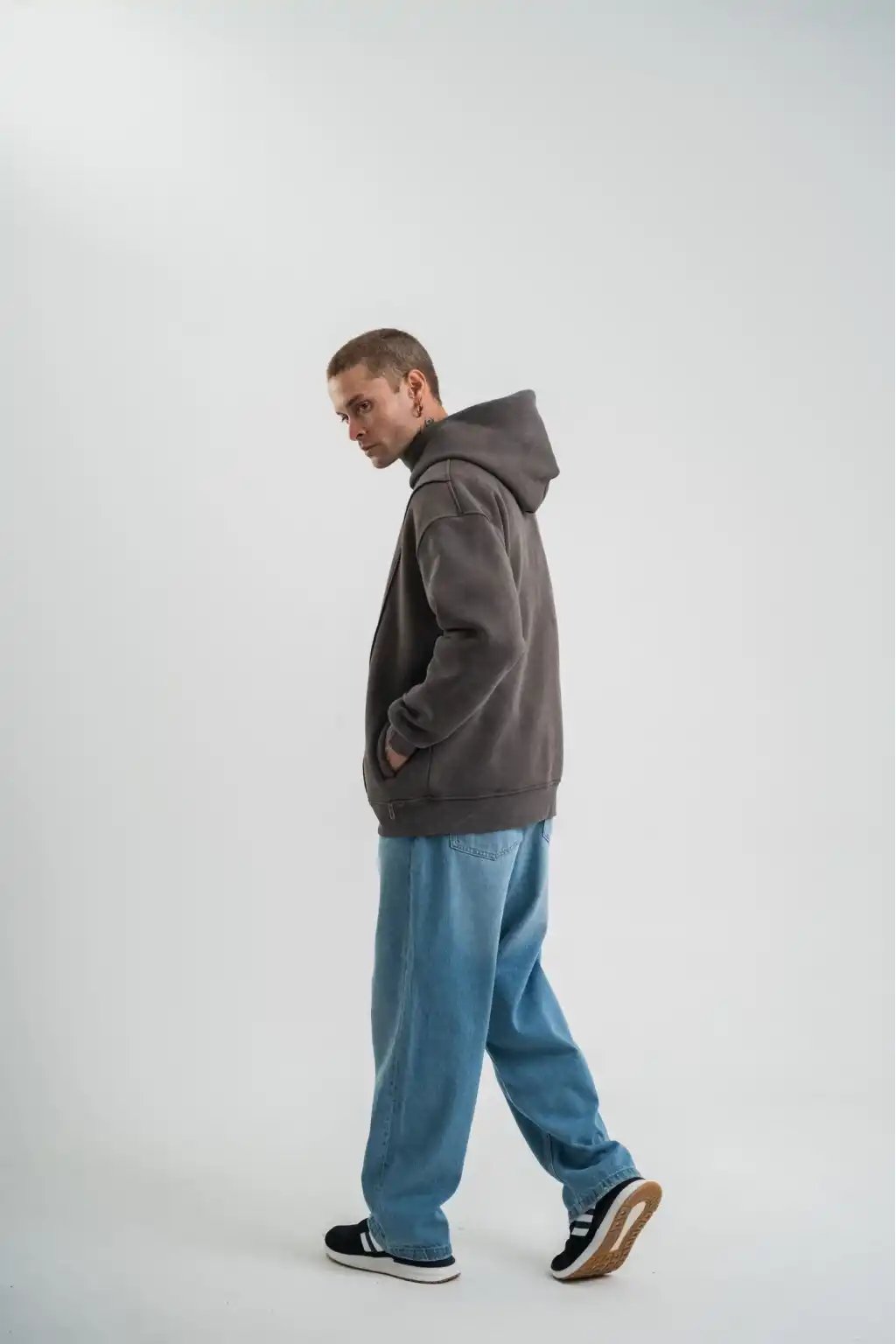 Unisex Uzun Kol Kapşonlu Yıkamalı Nakışlı SweatShirt - Füme