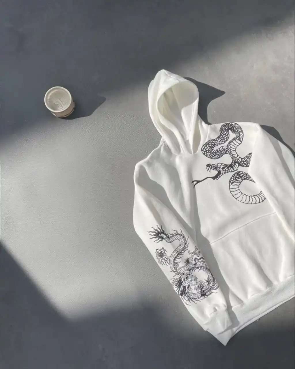 Uzun Kol Kapüşonlu Baskılı SweatShirt - Beyaz