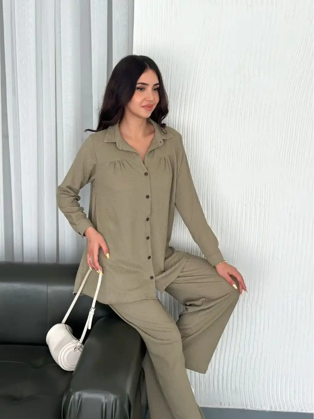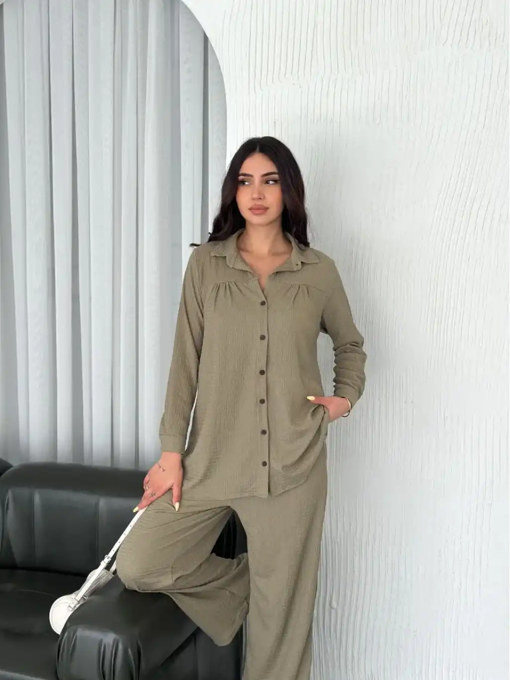 Kadın Kadife Oversize Takım – Gömlek ve Pantolon İkili Set Füme Corduroy Şıklığı, Rahat ve Zarif Duruş Yumuşak Dokulu Kadife Kumaş, Düğmeli Gömlek Üst ve Lastikli Pantolon Alt Parça ile Gün Boyu Konfor- haki